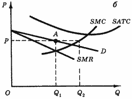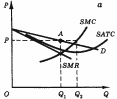 Фирма, действующая в условиях монополистической конкуренции, конечно, не совпадает с целой отраслью, как это было в случае фирмы-монополии. Но благодаря дифференциации на своем сегменте рынка она монополист. Поэтому и кривая спроса приобретает характерный отрицательный наклон: рост объема реализации достигается за счет снижения цен. Во-вторых, виден механизм определения фирмой оптимального размера производства. В условиях монополистической конкуренции (как и на любом другом типе рынка) фирма максимизирует прибыль при таком объеме, при котором SМС = SMR. Иными словами, фирма наращивает производство до тех пор, пока дополнительные затраты, связанные с выпуском еще одной единицы продукции, не начинают превышать выручку от ее реализации. Соответственно точка пересечения SМС и SMR на графике задает тот размер выпуска продукции Q1, продавая который по цене Р фирма максимизирует свою прибыль (рис. 8,а) или минимизирует убытки (рис. 8,б).