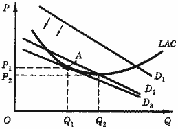 Для простоты изложения примем, что кривая затрат не меняется. Допустим также, что первоначально фирма получает экономическую прибыль (линия D1 лежит выше минимального уровня LAC). В условиях чистой монополии такая ситуация имела бы тенденцию к закреплению на длительное время, так как господствующая фирма не допустила бы на рынок новых производителей.