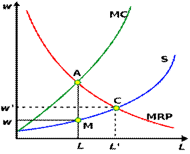 В связи с тем, что монополизация происходит со стороны спроса, то кривой спроса на труд не существует, а оптимальное количество нанимаемого труда определяется равенством предельной доходности труда и предельных издержек труда: