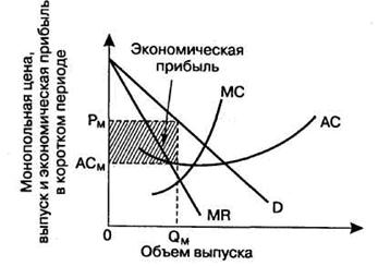 На рис. 1 изображены краткосрочные кривые средних и предельных издержек фирмы-монополиста, а также спрос на ее продукт и предельный доход от продукта. Монопольная фирма извлекает максимальную прибыль, производя объем благ, соответствующий точке, где MR = МС. Затем она устанавливает цену Рм, которая необходима, чтобы побудить покупателей купить объем благ QM. При данных цене и объеме производства фирма-монополист извлекает на единицу продукции прибыль (Рм - АСМ ). Общая экономическая прибыль равна (Рм - АСМ ) х QM.