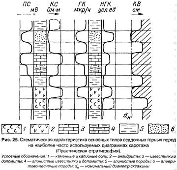 Первая задача, решаемая с помощью каротажа, — это определение литологического состава и глубин залегания кровли и подошвы слоя в скважинах. Наиболее важны для определения литологического состава слоев по каротажным диаграммам не абсолютные значения тех или иных параметров, зарегистрированных на диаграмме, а их соотношения (рис. 25).