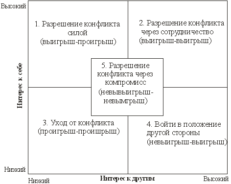 Межличностный конфликт вовлекает двух или более индивидов, если они воспринимают себя как находящихся в оппозиции друг к другу с позиций целей, расположений, ценностей или поведения. Это, пожалуй, самый распространенный тип конфликта. Индивиды, вступившие в межличностный конфликт, имеют пять возможных путей выхода из него. Если на основе двух переменных (интерес к себе и интерес к другим) построить матрицу, то, измеряя в каждом из случаев «интерес» как низкий или высокий, можно выявить следующие стили разрешения межличностного конфликта (рис.).