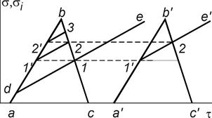 При втором ударе (a'b'c') уплотнение начинается уже с точки 1', соответственно возросшему внутреннему сопротивлению смеси sj, и смесь уплотнится в меру отрезка 1'–2. При третьем ударе она уплотнится в меру отрезка 2'–3 и так далее (для упрощения второй и третий удары совмещены на рисунке с первым ударом). С момента, когда точка b окажется ниже прямой de, дальнейшее уплотнение становится невозможным.