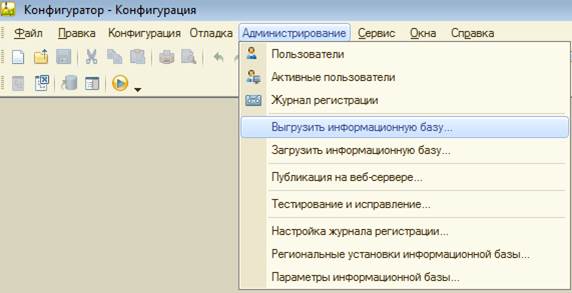 Для сохранения базы в режиме конфигуратора нужно выбрать пункт «Администрирование»/ «Выгрузить информационную базу».