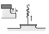 5) Круглая стеклянная пластина прикасается к воде (см.рис.). Ее тянут кверху посредством пружины L. Принимая для простоты расчета, что радиус кривизны R на высоте h/2 равен h/2, и пренебрегая второй кривизной боковой поверхности воды над пластиной, рассчитать силу, с которой натянута пружина L, при отрыве воды от пластины с площадью сечения 20см2.