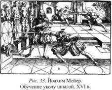 Развивается сложная техника приемов нападения уколами и защит. Необходимость изучения этой техники привела к возникновению специальных школ (рис. 34). Техника ударов шпагой не приобрела ничего нового, сохранив основные принципы ударных действий мечом. Для защиты в пеших боях в XV веке служил небольшой круглый щит (рис. 35), в начале XVI века появляется дага