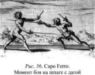 Обладая небольшими размерами, очень легкая по сравнению со шпагой, расположенная близко к противнику, дага позволяла ловить тяжелый шпажный клинок нападающего. Дага давала возможность использовать правую руку для ответственных ударов, повторных и сдвоенных атак (рис. 37). В положении близкой дистанции дагой нападали, действуя уколами (рис. 38). Характерной особенностью этого вида боя являются двойные действия. Выбрав момент, боец атакует сразу обоими видами оружия. При внезапной атаке двойным уколом или комбинацией укола и удара защита оружием представляет чрезвычайно трудное действие. В этом случае спасало движение. Бой на шпаге с дагой располагал большим количеством двойных защит,