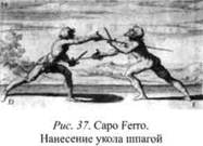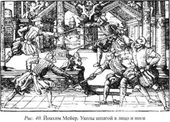 Длинная плоская шпага была неудобным оружием, так как клинок своей гибкостью мешал выполнению уколов, а нанесение ударов было затруднено легкостью клинка. Бой этого периода характерен нанесением ударов и уколов в части тела, наиболее легко уязвимые и слабо защищенные одеждой: в голову, особенно лицо, кисти рук и ноги ниже колен (рис. 40).