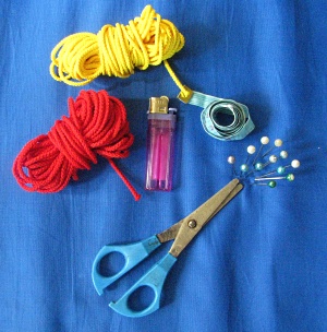 синтетический шнур, ножницы, английская булавка, сантиметр, подушка для плетения, зажигалка