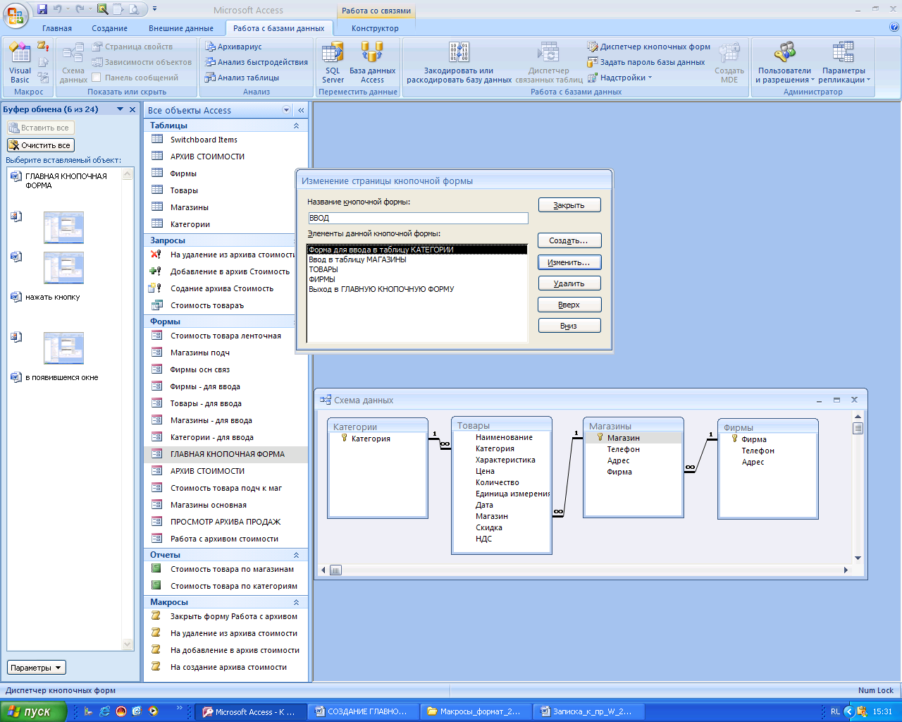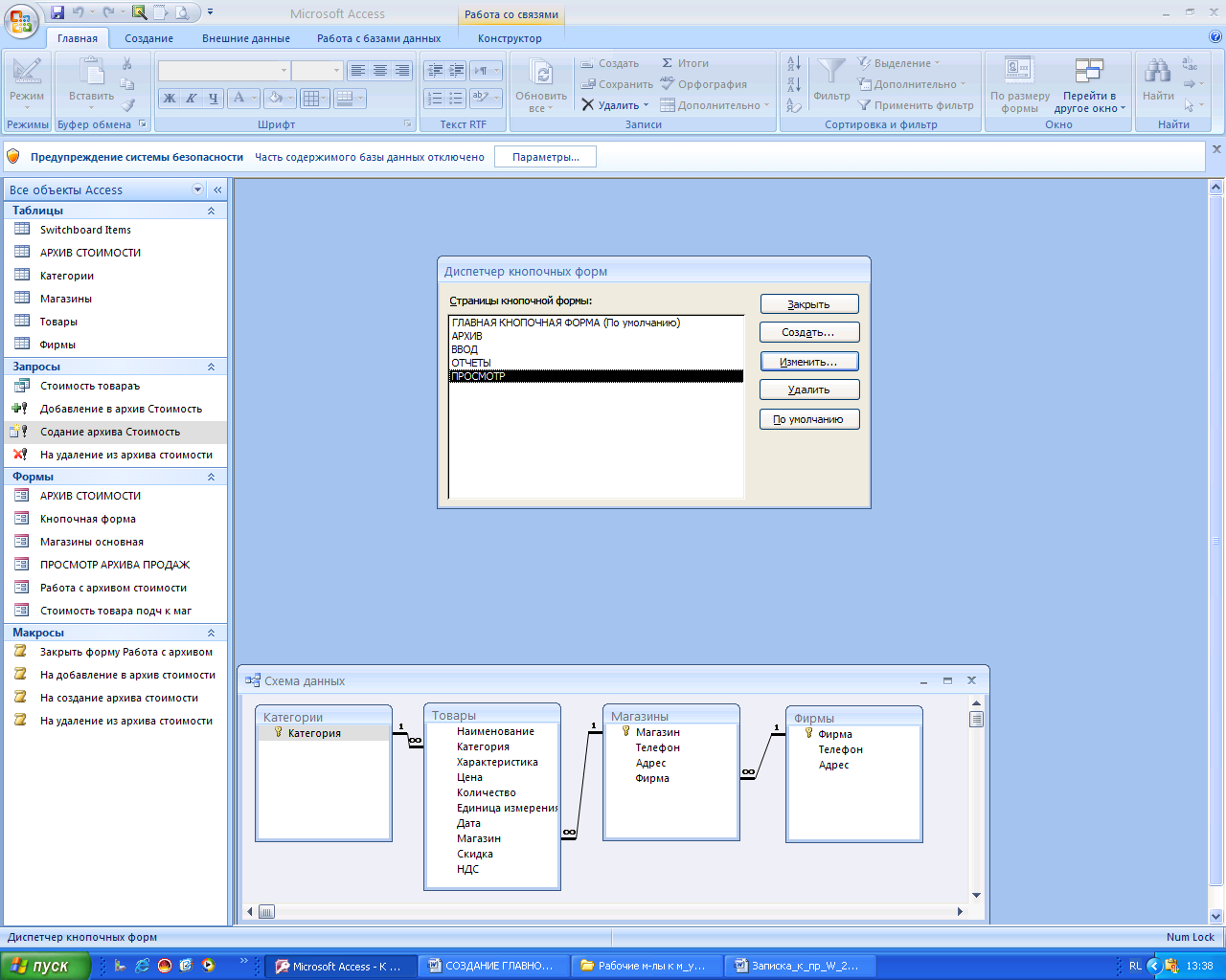 · повторить эту процедуру для кнопочных форм ПРОСМОТР, ОТЧЕТЫ, АРХИВ.