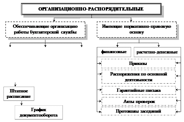 Часть бухгалтерского дела, непосредственно связанная с созданием документов, называется документированием. Особое место среди документов бухгалтерии занимает немногочисленная, но исключительно важная для этого подразделения организационно-распорядительная документация, обеспечивающая как организацию работы бухгалтерской службы, так и нормативно-правовую основу многих финансовых и расчетно-денежных операций (рисунок 5). Правильное составление и оформление этих документов в соответствии с действующими нормативами - один из важнейших элементов бухгалтерского дела.