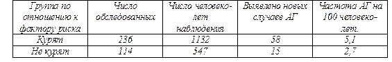Относительное сравнение тех же показателей дает величину 1,9 раза, т. е. относительный риск (коэффициент риска) ОР=1,9. Отсюда, пока только предположительно, можно утверждать, что в Москве риск развития АГ у курящих мужчин в возрасте 40-59 лет почти в 2 раза выше, чем у некурящих мужчин того же возраста.