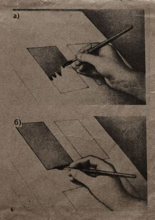 Для отмывки обычно используют краски теплых нейтральных тонов (марс коричневый, умбра жженая, сепия) или черного цвета (жженая кость, ламповая копоть, нейтральтин и т. п.). Перед употреблением раствор краски нужно профильтровать. При отмывке бумага, на которую наносится краска, должна иметь уклон 20—30°. Краску кистью перемещают сверху вниз (рис. 339, а) с таким расчетом, чтобы нижняя граница не успевала высыхать (снизу должен быть натек).