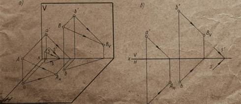 Если тень от точки падает на плоскость проекций, то тенью является горизонтальный или фронтальный след луча света, проходящего через данную точку. Луч света, проведенный через точку А (рис. 224, а и б), пересечет прежде плоскость А. Таким образом, тень от точки А упадет на горизонтальную плоскость проекций. Луч, проведенный через точку В, пересечет сначала плоскость V. Следовательно, тень от точки В упадет на фронтальную плоскость.