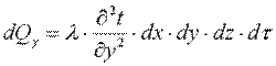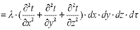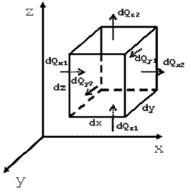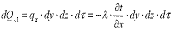 Выделим в теле элементарный параллелепипед с ребрами dx, dy, dz (рис. 9.1). Количество теплоты, которое проходит путем теплопроводности внутрь выделенного объема в направлении оси ОX через элементарную площадку dy·dz за время dτ: