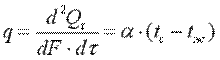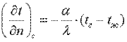 где tc — температура поверхности тела; α — коэффициент пропорциональности, называемый коэффициентом теплоотдачи, Вт/(м2·К). Коэффициент теплоотдачи численно равен количеству теплоты, отдаваемому или воспринимаемому единицей поверхности в единицу времени при разности температур между поверхностью тела и окружающей средой в один градус. Этот коэффициент учитывает все особенности явлении теплообмена, происходящие между поверхностью тела и окружающей средой. Плотность теплового потока, передаваемого от поверхности тела в окружающую среду,