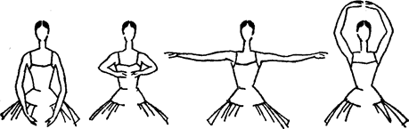 В своей терминологии танца я пользуюсь только тремя позициями рук; все остальные положения рук являются их разновидностью, и я считаю излишним вводить для них особое название, тем более что движения рук всегда необходимо показывать, когда дело доходит до танца или до более сложного примера на уроке.