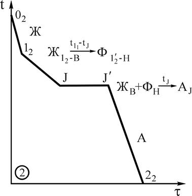 | Рис.5. Кривая охлаждения, фазовые реакции и схемы структур на всех этапах охлаждения сплава 2 |