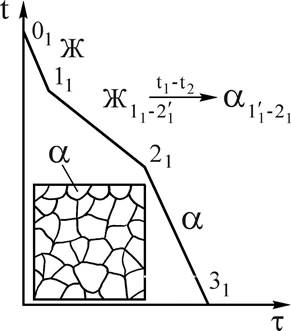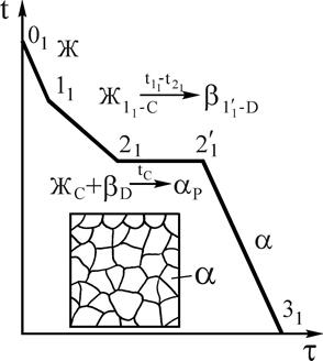 Рис.6. Кривая охлаждения и схема структуры сплава 1 при нормальной температуре