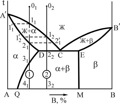 Рис.5. Диаграмма состояния системы А-B с эвтектическим превращением