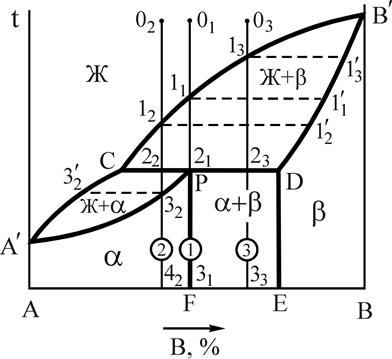 В данной системе компоненты: А и В (К=2), фазы: Ж, a, b (Ф=3); a-ограниченный твердый раствор компонента В в A, b-ограниченный твердый раствор компонента А в В. Линии А'СВ' - ликвидус, А'PDВ' - линии солидус, линия СРD - линия перитектического превращения, линия PF линия предельной растворимости компонента B в А, линия DЕ - предельной растворимости А в B.
