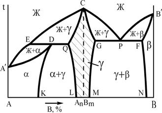 Физически, выполняя функцию компонента, химическое соединение на базе своей решетки, как правило, образует по схеме замещения ограниченный твердый раствор g. Плавление (кристаллизация) g-фазы состава АnВm в соответствии с правилом фаз (С=0) происходит при постоянной температуре. Прочтение диаграмм и анализ фазового состояния системы А-В производится по частям, имея ввиду независимость систем А-АnВm и АnВm-В. Особенность диаграмм с устойчивым химическим соединением является область g-фазы. В этой области левее фигуративной линии химического соединения (заштрихована) представлены твердые растворы замещения компонента А, а правее фигуративной линии – растворы компонента В в химическом соединении. При образовании твердых растворов атомы компонента А замещают атомы компонента В в узлах кристаллической решетки соединения АnВm или наоборот. Таким образом формируется область g-раствора переменной концентрации с решеткой, свойственной химическому соединению. В силу этих особенностей g-фаза называется промежуточной.