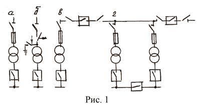 Схемы сборных комплектных трансформаторных подстанций типа СКТП-35 показаны на рис. 1 , где а - тупиковая однотрансформаторная подстанция с защитой плавкими предохранителями (перед плавкими предохранителями установлен разъединитель, а после трансформатора - масляный выключатель);