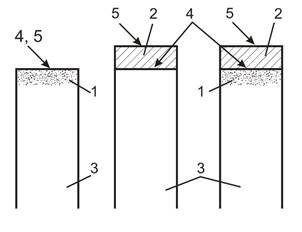 | Рисунок 1.4 – Схематичне зображення поверхневих шарів: а – тільки поверхневий шар; б – тільки покриття; в – поверхневий шар + покриття; 1 – поверхневий шар; 2 – покриття; 3 – основа; 4 – первинна поверхня деталі; 5 – остаточна поверхня деталі |