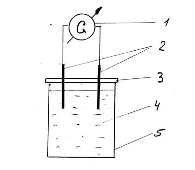 Рис. 4 - Схема моделювання електрохімічної корозії металів: 1 – гальванометр; 2- зразки металів; 3 – ізолююча кришка; 4 - розчин електроліту;