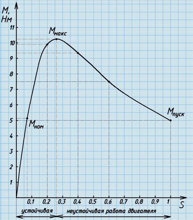 Из заданной по условию задачи перегрузочной способности двигателя (Ммакс/Мно = 2,0) определим максимальный вращающий момент:
