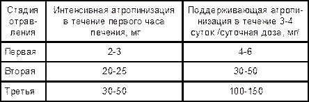 Средние дозы атропина, используемые для купирования мускариноподобного действия при различных стадиях острого отравления ФОВ