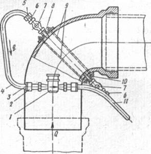 Действие парциальных расходомеров в отличие от рассмотренных ранее основано на измерении не всего расхода, а лишь части его. На рис. 6 представлена схема парциального водомера, являющегося комбинацией скоростного крыльчатого водомера и колена, выполняющего функцию сужающего органа. Расход воды Q через ответвление трубопровода пропорционален величине основного потока р. Поэтому количество воды, протекающей по трубопроводу, можно определить путем умножения показаний скоростного водомера на постоянный коэффициент.