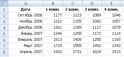 В первую очередь необходимо сформировать таблицу с данными так, как показано на рис. 1. Первый столбец должен содержать даты с интервалом по месяцам, в остальные столбцы следует внести информацию о стоимости квадратного метра жилья в квартирах с различным числом комнат. Для каждого столбца также создайте заголовок.