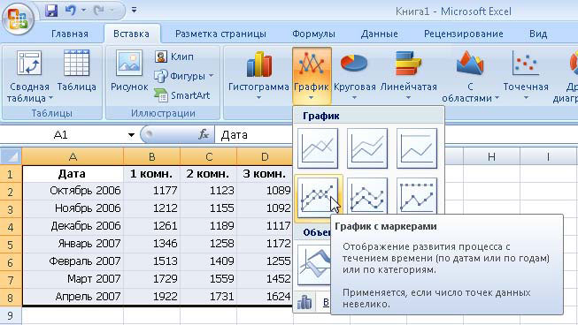 После того как таблица будет создана, выделите все ее ячейки, включая заголовки, перейдите на вкладку Вставка и в группе Диаграммы щелкните на кнопке График. Для нашей задачи лучше всего подойдет график с маркерами (рис.2). Выберите его щелчком.