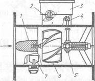 Схема скоростного счетчика с аксиальной турбинкой показана на рис. 7.3. Внутри корпуса размещена горизонтально вдоль направления измеряемого потока жидкости турбинка 6, выполненная в виде многозаходного винта. Перед турбинкой установлен струе-выпрямитель 1, предназначенный для сглаживания возмущений потока на входе и исключения завихрения. Вращение турбинки через червячную пару 5 и передаточный механизм 2, расположенный в камере 4, передается через сальник счетному устройству 3.