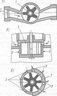 В многоструйных счетчиках (рис. 7.4, б) корпус выполнен так, что в нем имеется два ряда равномерно распределенных по окружности сопл. Расположение сопл в корпусе счетчика показан на рис. 7.4, в. Через нижний ряд сопл 2 жидкость подается на турбин-ку /, а через верхний ряд сопл 3 отводится из камеры вращения турбинки. Одноструйные счетчики более просты по конструкции и в них меньше потеря давления, но они имеют меньшую надежность из-за одностороннего износа опоры турбинки.