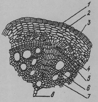 5 — перицикл; 6— флоема; 7— ксилема; 8— камбій