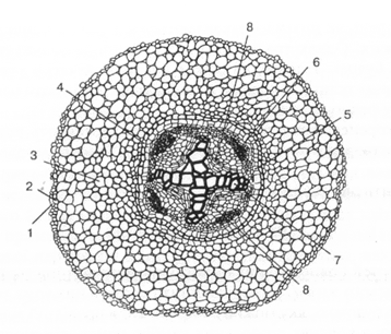 Рис. 2. Вторинна будова кореня: 1 — перидерма, 2 — паренхіма кори, 3,7 — вторинна ксилема, 4 — міжпучковий камбій, 5 — пучковий камбій, 6 — радіальний промінь, 8 — первинна ксилема