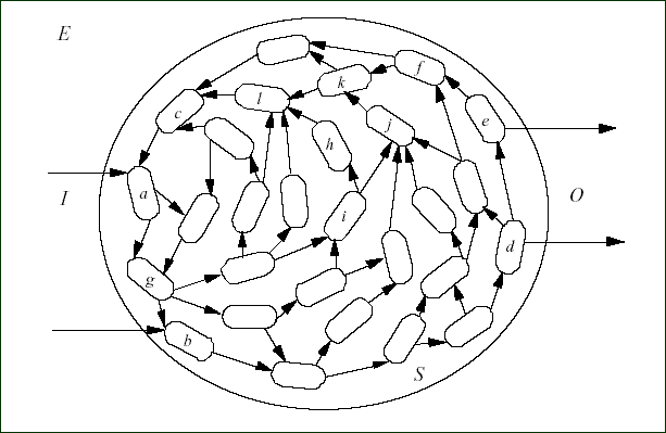 Многоэлементная кибернетическая система S строится из набора элементов {a, b, c, d, i, h, …} путем отождествления выхода одних элементов с входами других. Свободные входы и выходы образуют вход I (input) и выход O (output) всей кибернетической системы, см. рис. 6. Система S состоит из сети компонентов или подсистем {a, b, c, d,...}, связанных друг с другом через входы и выходы, они постоянно воспроизводят собственную организацию. Например, вход элемента l связан с выходами k и h (товары, услуги, информация,), а выход l связан с входом c. В целом, сеть замкнута (пути, соединяющие компоненты, находятся внутри системы), но она связана с окружающей средой E через вход I и выход O. В сети существует ряд избыточных или "параллельных" путей, которые начинаются из одного и того же компонента (например, i ) и заканчиваются на одном компоненте (например, l ). В этом особом случае компонент h выполняет ту же самую функцию для l как j и k , к тому же l может предпочесть обходной путь i ® j ® k ®l более короткому пути i ® h ® l.