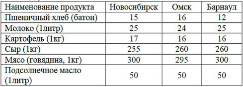 В5. В таблице указаны средние цены (в рублях) на некоторые основные продукты питания в трех городах России (по данным на начало 2010года).