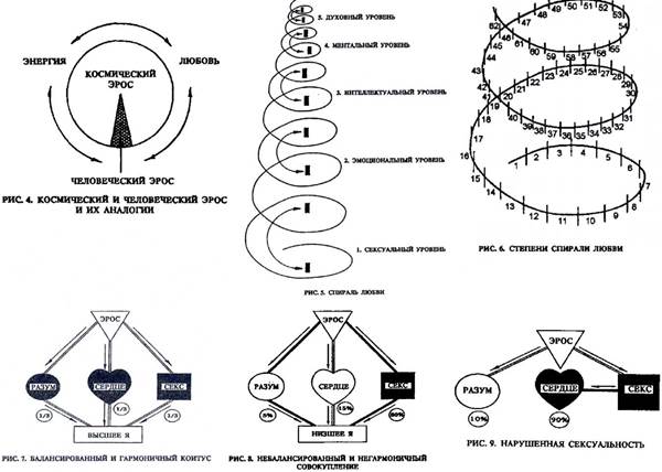 Эротическая энергия составляет лишь часть космического Эроса, который действует на уровне человека, порождая любовное влечение. Секс и Эрос не однозначны, поскольку половые органы соответствуют только одному уровню проявления человеческого Эроса, который находит выражение благодаря указанным ниже уровням. Их можно рассматривать как спираль, витки которой суживаются кверху, иллюстрируя переход от сексуального к духовному.