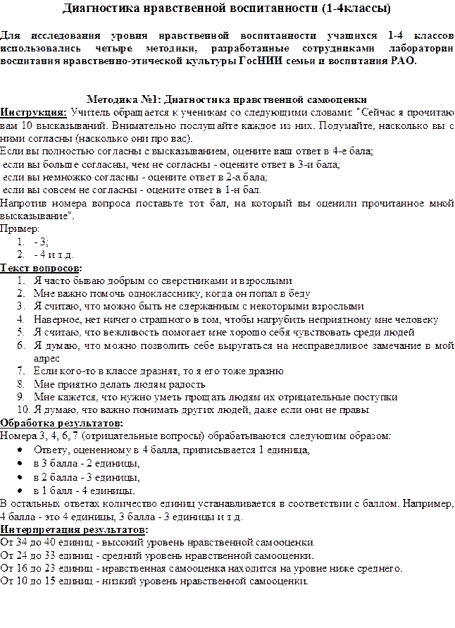 Диагностика этики поведения была проведена в конце 4 класса, т.к. рекомендуется специалистами для детей возраста 10-11 лет. Результаты оказались положительные: