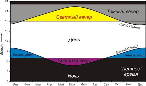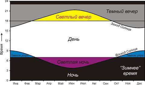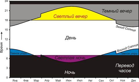 Конечно, у этой схемы есть и недостаток, о котором было сказано выше – необходимость утреннего подъема в темноте в течение двух зимних месяцев. Это отражено синим цветом на диаграмме. Но эта проблема существует и в шкале «зимнего» времени, просто она занимает там меньший отрезок времени и касается меньшего числа людей, рано начинающих рабочий день.