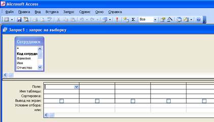 · Перетащите символ * из таблицы «Сотрудники» в поле запроса, это действие позволит применить запрос ко всем полям таблицы.