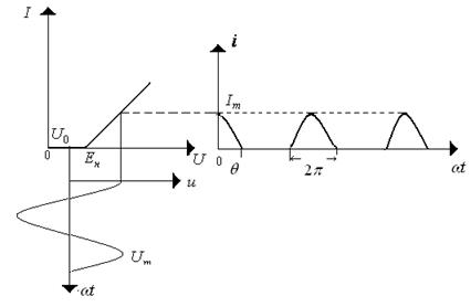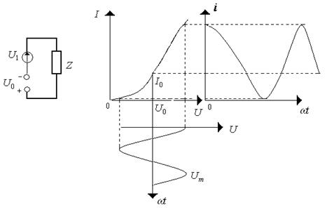 . Используя вольтамперную характеристику нелинейного элемента. Проведя несложные гармонические построения, найдем аналитическую запись формы тока в радиоэлектронной цепи в зависимости от фазового угла ν =ωt (рис.10.2б, в).
