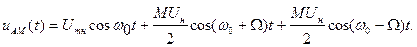 Из формулы (10.22) видно, что при однотональной модуляции спектр АМ-сигнала состоит из трех высокочастотных составляющих. Первая из них представляет собой исходное несущее колебание с амплитудой