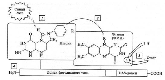1 — получение кванта синего света птериновым ядром; 2 — передача возбуждения на ядро флавина; 3 — ответ в форме редокс-реакции; 4 — функциональные домены белковой части криптохрома