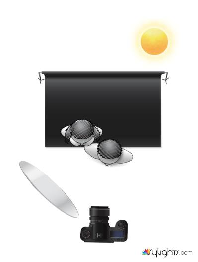На этой диаграмме черный фон представляет задний план с деревьями. Солнечный свет идет из- за деревьев сзади, но они полностью в тени. Белый отражатель, расположенный слева от камеры, отражает свет обратно на лица фотографируемых. Подбирая расположение отражателя, можно изменять освещение лиц людей. Петлевое освещение достигается его расположением примерно на 30-45 градусов от камеры. Отражатель также должен располагаться чуть выше уровня их глаз, чтобы тень от носа ложилась слегка вниз, к углу рта. Одна из распространенных ошибок у начинающих – это низкое расположение отражателя и его наклон. В результате лицо и нос подсвечиваются снизу, что выглядит некрасиво.