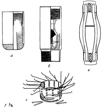 | Рис. 8.4. Дополнительное оборудование для заканчивания скважины: а — направляющий башмак; б — муфта с обратным клапаном; в— центратор; г— скребок (собственность Halliburton) |