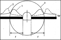 (l — зона разуплотнения угля краевой части угольного пласта; 1,2 — напряжения в зоне опорного давления до и после разуплотнения угольного пласта, 3 — область разгруженных пород